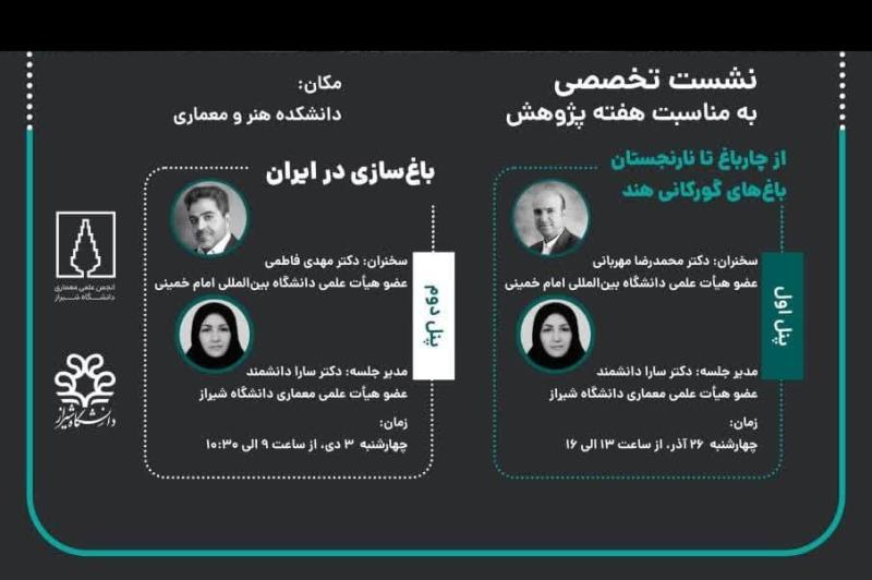 به مناسبت هفته پژوهش، نشست تخصصی «از چهارباغ تا نارنجستان » به همت انجمن علمی معماری و معاونت پژوهشی دانشکده هنر و معماری با هدف بررسی مفاهیم تاریخی و فرهنگی باغ‌سازی در معماری، در قالب دو پنل علمی برگزارشد.